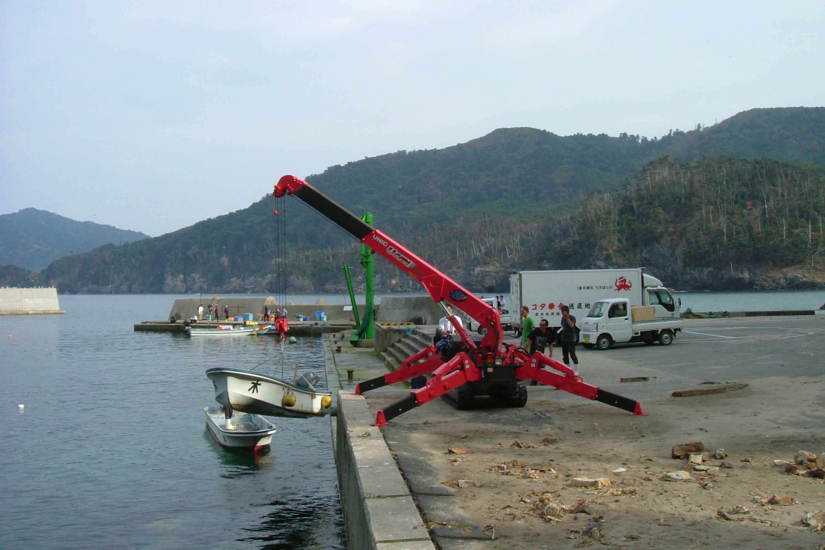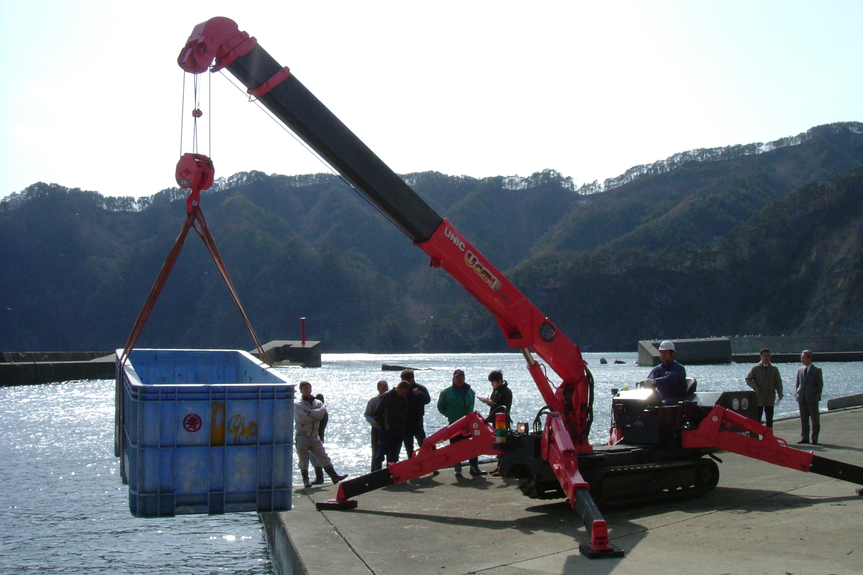 東日本大震災では、三陸沿岸の漁港や港湾施設が甚大な被害を受け、多くの漁業関係者が操業再開の目途を立てられない状況に置かれました。当社は、悪路でも自走可能なクローラクレーンの特性を生かし、被災地の小型船舶の移動や漁具の揚げ降ろしを支援するため、「ミニ・クローラクレーン」を無償で貸し出し、早期復旧に向けた活動を行いました。