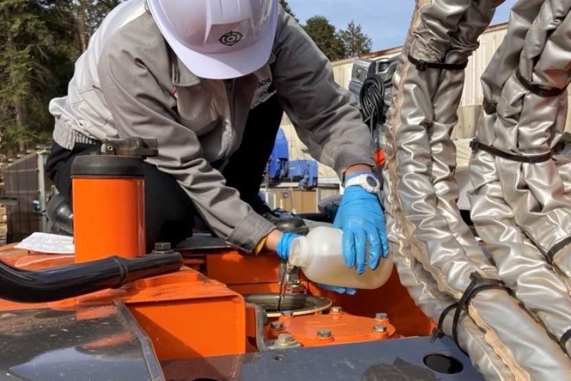 さらに、建設機械の「血液」に相当する作動油の再生技術も開発しました。専用装置による浄油と添加剤投入により、劣化した作動油の性能を回復させ、交換に伴う資源消費を抑制します。