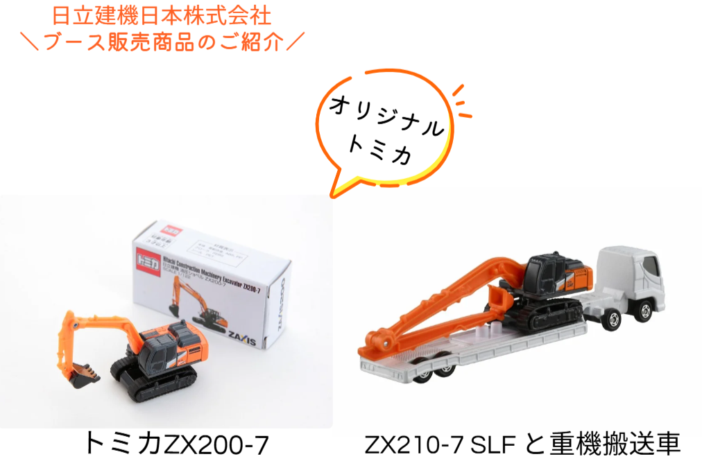 屋内では、オリジナルトミカや本格的なダイキャストモデル、そして日常でも使いたくなる重機が描かれたデザインのオリジナルラウンドバックなど、ファン心をくすぐるグッズが勢ぞろい。